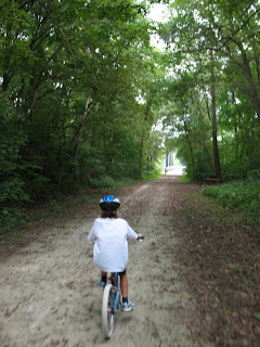 Busy week this week (first full week of classes). Since Bradley University has classes on Labor Day we did not travel far away this weekend. (We do take off in October for Fall Break, which is better.) We drove to Wyoming, IL, where we biked/walked on the Rock Island Trail. The trail, which was once a rail line, starts much closer to Peoria, but some of the more interesting aspects of the trail (a train station and a trestle over the Spoon River) were nearby where we started. We took the trail to the town limits of Toulon, IL, and back, giving us a 9.4 mile trip. The trail was pretty level and covered with limestone chips. It mostly goes through farm country, but a large part of the trail is tree-lined, essentially a long, narrow woods. A few leaves are just starting to turn and fall - I imagine in a month things will look quite pretty. After this, we traveled to Tanner's Orchard to pick a peck of Honey Crisp apples. I'm not a huge apple fan, but they are pretty good. We have not been to Tanner's for years, and it is a nice way to celebrate fall...OK, OK, it felt a little premature, but hey, we were in the area. There were interesting things to sample, the cider was great, the green bean "chips" (dried green beans) weren't bad, the baby beet balls were not what I expected, and the apple salsa was pretty good. Of course we bought apple cider doughnuts and the smells were wonderful (this is the thing I think of most when I think of Tanners). Of course I had to get a picture of Karen with a bunch of other "mums". Kris is somewhat outgrowing the little kid stuff, which was a little sad, but on the other hand, she is sophisticated enough now to enjoy listening to the Bill Cosby tape that I rediscovered in a box in the basement last night - I used to listen to it in college.